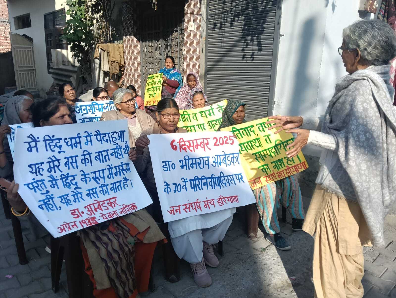 कुरूक्षेत्र । बाबा साहेब डॉ भीमराव अम्बेडकर जी के 70वें निर्वाण दिवस पर उनकी याद में जन संघर्ष मंच हरियाणा की ओर से कीर्ति नगर व गांधी नगर,कुरुक्षेत्र में सभा व प्रदर्शन किया गया। मंच की प्रांतीय महासचिव सुदेश कुमारी, वरिष्ठ नेत्री चन्द्र रेखा, ऊषा कुमारी व अन्यों ने डॉक्टर भीमराव अंबेडकर जी को अपनी पुष्पांजलि अर्पित की।