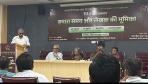 कार्यक्रम के इस विचार सत्र की अध्यक्षता चंचल चौहान, इब्बार रब्बी और खालिद अशरफ़ ने की।इस सत्र में मुख्य अतिथि के रूप में आमंत्रित शाश्वती मजुमदार ने *”हमारा समय और लेखक की भूमिका”* विषय पर बात करते हुए कहा कि लेखक का कार्य लोगों को सच्चाई बताना है। बस इतना बताना आवश्यक नहीं है कि फासीवाद खतरनाक है बल्कि उसके पीछे के कारणों को बताना भी आवश्यक है।