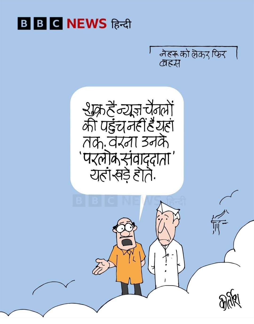 वर्तमान राजनीतिक माहौल में सत्तारूढ़ दल के नेेताओं और मंत्रियों ने वाद विवाद संवाद का जो सिलसिला शुरू किया है, संदर्भ हो या न हो, नेहरू का लेना-देना हो न हो, हर बात में उनको घसीटना और नाकामियों के लिए उनको दोषी ठहराने का उपक्रम किया है, उनकी जी हजूरी में आगे बढ़कर न्यूज चैनलों ने पत्रकारिता का जिस तरह सत्यानाश किया है, उस पर बीबीसी हिंदी ने कार्टून प्रकाशित किया है। उसी पर केंद्रित कर वरिष्ठ पत्रकार विजय शंकर पांडेय ने यह व्यंग्य लिखा है। बीबीसी और पांडेय जी का आभार जताते हुए यहां उसे प्रकाशित कर रहे हैं –